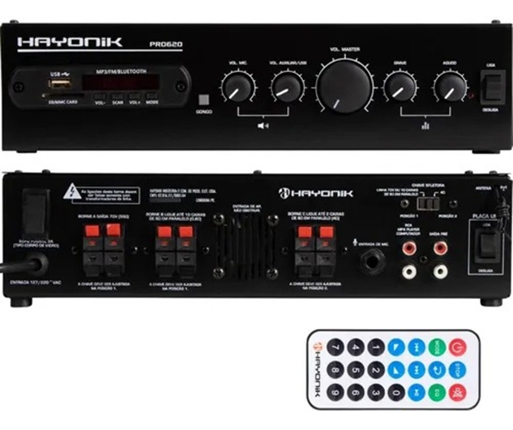 O Amplificador Hayonik PRO620 é a solução para a amplificação para seu sistema de som ambiente! Utilizado para sonorizar diversos ambientes tais como estabelecimentos comerciais, escritórios, clínicas e até mesmo em casa ou em áreas de lazer.