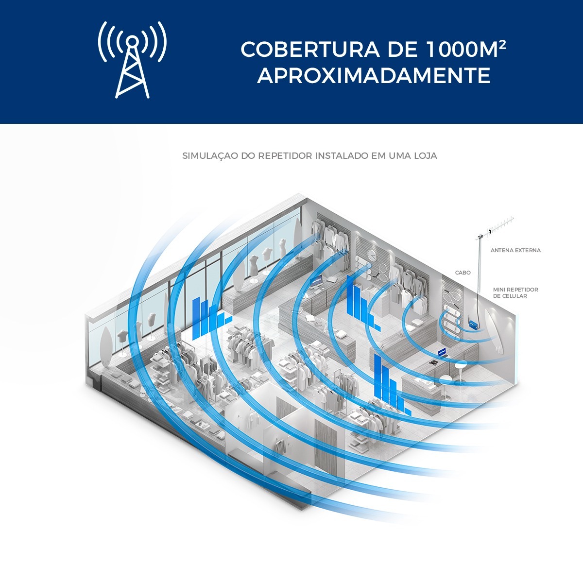 Qualidade de sinal celular onde quer que você esteja O Mini Repetidor Celular Aquário distribui sinal para vários aparelhos ao mesmo tempo em áreas internas de até 1000m²*. O melhor posicionamento de sua Antena externa aumenta a captação de sinal celular que é amplificado e distribuído pela Antena interna, garantindo qualidade nas ligações e em conexões de internet móvel. Prático, pode ser utilizado em instalações residenciais e comerciais, como, escritórios, galpões, subsolos, galerias etc. Soluções Aquário para telefonia Celular, você conectado sempre! *Em áreas com condições favoráveis e sem barreiras Consulte sua operadora e saiba qual a frequência indicada para região.